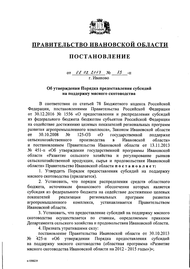 Постановление Правительства Ивановской области от 08.02.2017 N 33-п "Об утверждении Порядка предоставления субсидий на поддержку мясного скотоводства"