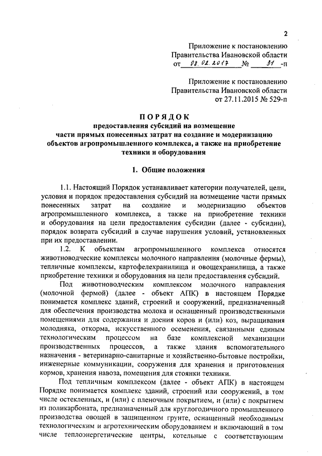 Постановление Правительства Ивановской области от 08.02.2017 N 31-п "О внесении изменения в постановление Правительства Ивановской области от 27.11.2015 N 529-п "Об утверждении Порядка предоставления субсидий на возмещение части прямых понесенных затрат на создание и модернизацию объектов агропромышленного комплекса, а также на приобретение техники и оборудования"