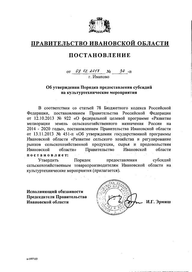 Постановление Правительства Ивановской области от 08.02.2017 N 30-п "Об утверждении Порядка предоставления субсидий на культуртехнические мероприятия"