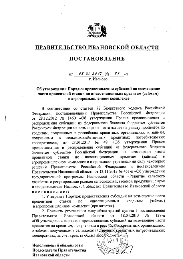 Постановление Правительства Ивановской области от 08.02.2017 N 37-п "Об утверждении Порядка предоставления субсидий на возмещение части процентной ставки по инвестиционным кредитам (займам) в агропромышленном комплексе"
