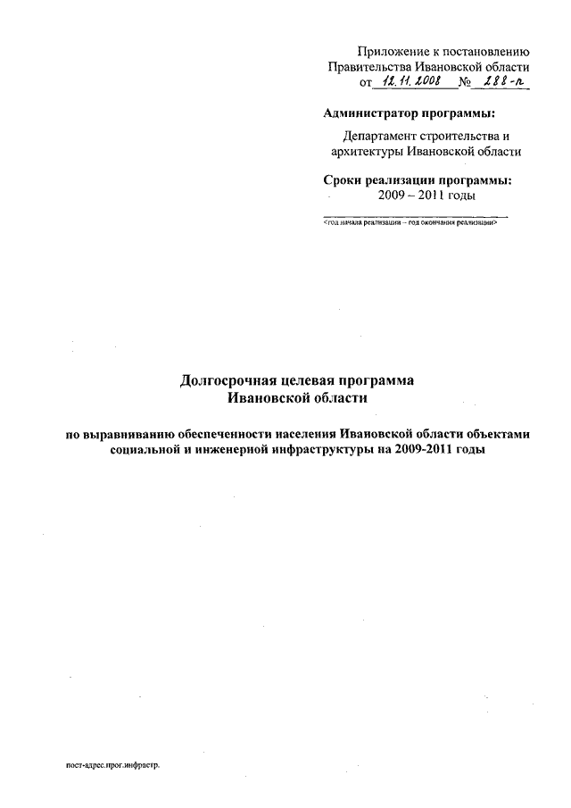 Постановление Правительства Ивановской области от 12.11.2008 N 288-п "Об утверждении долгосрочной целевой программы Ивановской области по выравниванию обеспеченности населения Ивановской области объектами социальной и инженерной инфраструктуры на 2009 - 2011 годы"