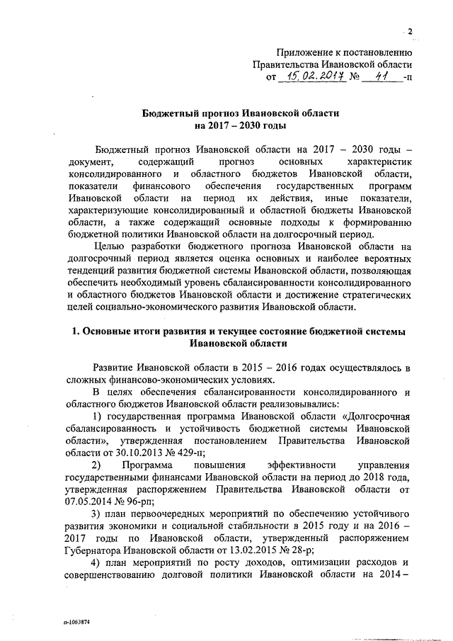 Постановление Правительства Ивановской области от 15.02.2017 N 41-п "Об утверждении бюджетного прогноза Ивановской области на 2017 - 2030 годы"