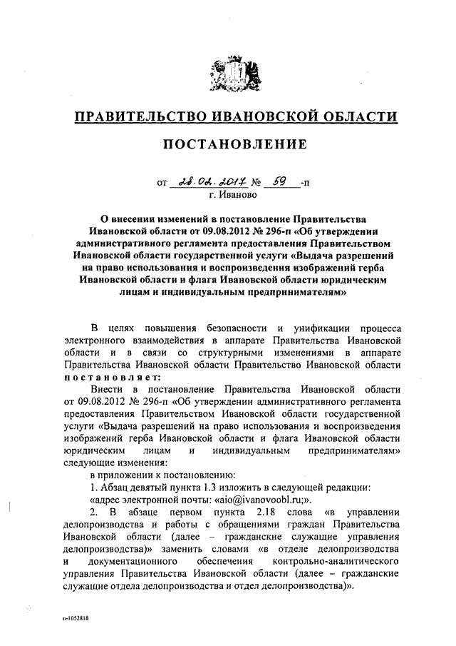 Постановление Правительства Ивановской области от 28.02.2017 N 59-п "О внесении изменений в постановление Правительства Ивановской области от 09.08.2012 N 296-п "Об утверждении административного регламента предоставления Правительством Ивановской области государственной услуги "Выдача разрешений на право использования и воспроизведения изображений герба Ивановской области и флага Ивановской области юридическим лицам и индивидуальным предпринимателям"