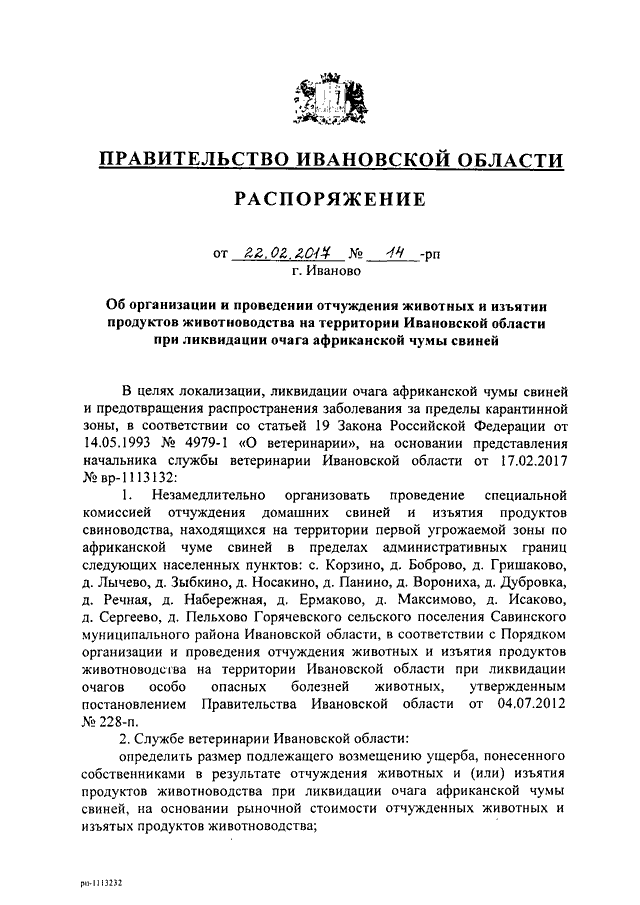 Распоряжение Правительства Ивановской области от 22.02.2017 N 14-рп "Об организации и проведении отчуждения животных и изъятии продуктов животноводства на территории Ивановской области при ликвидации очага африканской чумы свиней"
