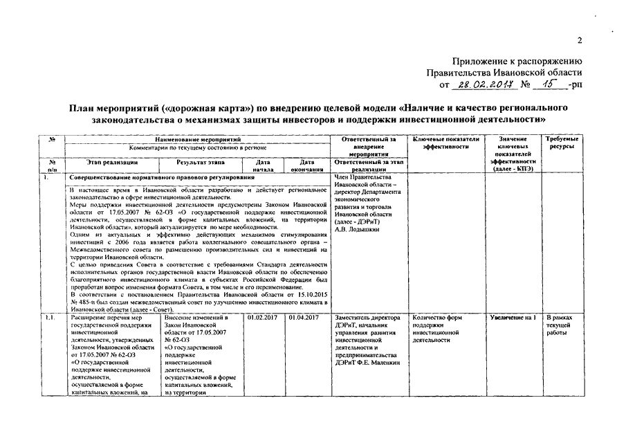Распоряжение Правительства Ивановской области от 28.02.2017 N 15-рп "Об утверждении планов мероприятий ("дорожных карт") по целевым моделям "Наличие и качество регионального законодательства о механизмах защиты инвесторов и поддержки инвестиционной деятельности", "Эффективность обратной связи и работы каналов прямой связи инвесторов и руководства Ивановской области", "Эффективность деятельности специализированной организации по привлечению инвестиций и работе с инвесторами", "Качество инвестиционного портала Ивановской области"