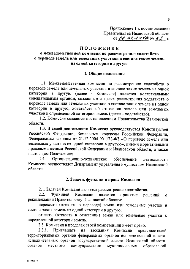 Постановление Правительства Ивановской области от 06.03.2017 N 63-п "О рассмотрении ходатайств о переводе земель или земельных участков в составе таких земель из одной категории в другую" (вместе с "Положением о межведомственной комиссии по рассмотрению ходатайств о переводе земель или земельных участков в составе таких земель из одной категории в другую", "Порядком взаимодействия исполнительных органов государственной власти Ивановской области и межведомственной комиссии по рассмотрению ходатайств о переводе земель или земельных участков в составе таких земель из одной категории в другую")