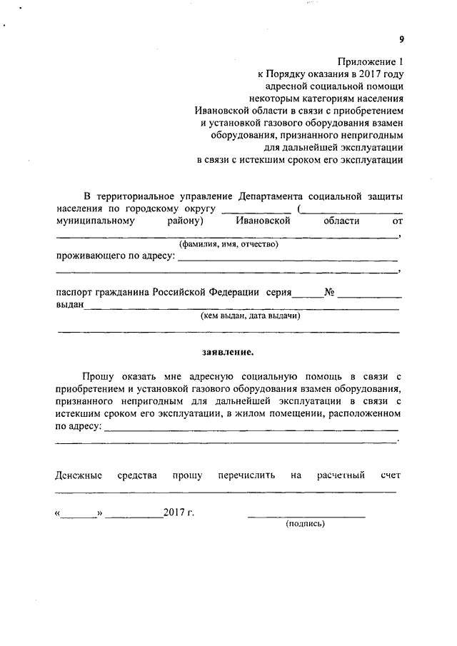 Постановление Правительства Ивановской области от 07.03.2017 N 65-п "Об утверждении Порядка оказания в 2017 году адресной социальной помощи некоторым категориям населения Ивановской области в связи с приобретением и установкой газового оборудования взамен оборудования, признанного непригодным для дальнейшей эксплуатации в связи с истекшим сроком его эксплуатации"
