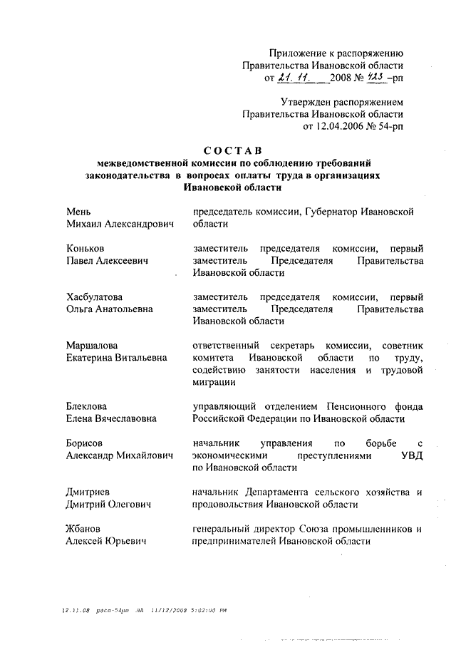 Распоряжение Правительства Ивановской области от 21.11.2008 N 423-рп "О внесении изменения в распоряжение Правительства Ивановской области от 12.04.2006 N 54-рп"