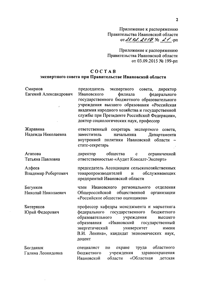 Распоряжение Правительства Ивановской области от 28.02.2017 N 21-рп "О внесении изменения в распоряжение Правительства Ивановской области от 03.09.2015 N 199-рп "Об утверждении состава экспертного совета при Правительстве Ивановской области"