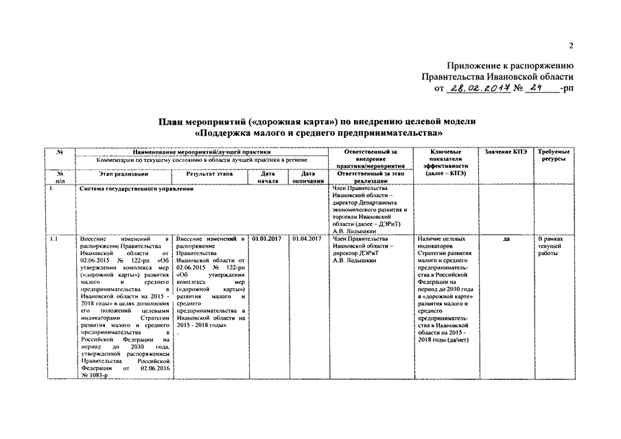 Распоряжение Правительства Ивановской области от 28.02.2017 N 24-рп "Об утверждении планов мероприятий ("дорожных карт") по внедрению целевых моделей "Поддержка малого и среднего предпринимательства", "Регистрация права собственности на земельные участки и объекты недвижимого имущества" и "Постановка на кадастровый учет земельных участков и объектов недвижимого имущества"