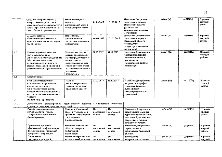 Распоряжение Правительства Ивановской области от 28.02.2017 N 25-рп "Об утверждении планов мероприятий ("дорожных карт") по внедрению целевых моделей "Технологическое присоединение к электрическим сетям", "Подключение (технологическое присоединение) к сетям газораспределения", "Подключение к системам теплоснабжения, подключение (технологическое присоединение) к централизованным системам водоснабжения и водоотведения" (вместе с "Планом мероприятий ("дорожной картой") по внедрению целевой модели "Технологическое присоединение к электрическим сетям" в отношении энергопринимающих устройств мощностью до 150 кВт", "Планом мероприятий ("дорожной картой") по внедрению целевой модели "Подключение к системам теплоснабжения, подключение (технологическое присоединение) к централизованным системам водоснабжения и водоотведения" с нагрузками до 1,5 Гкал/час и не более 10 м3/час соответственно", "Планом мероприятий ("дорожной картой") по внедрению целевой модели по направлению "Подключение к сетям газораспределения" в отношении газоиспользующего оборудования с максимальным расходом газа от 15 до 42 куб. метров в час, с проектным рабочим давлением в присоединяемом газопроводе-вводе не более 0,3 МПа и расстоянием от земельного участка заявителя до сети газораспределения, измеряемым по прямой линии, не более 150 метров")
