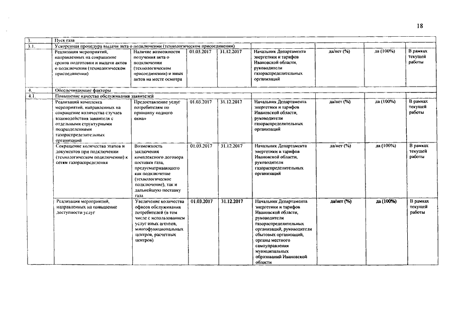 Распоряжение Правительства Ивановской области от 28.02.2017 N 25-рп "Об утверждении планов мероприятий ("дорожных карт") по внедрению целевых моделей "Технологическое присоединение к электрическим сетям", "Подключение (технологическое присоединение) к сетям газораспределения", "Подключение к системам теплоснабжения, подключение (технологическое присоединение) к централизованным системам водоснабжения и водоотведения" (вместе с "Планом мероприятий ("дорожной картой") по внедрению целевой модели "Технологическое присоединение к электрическим сетям" в отношении энергопринимающих устройств мощностью до 150 кВт", "Планом мероприятий ("дорожной картой") по внедрению целевой модели "Подключение к системам теплоснабжения, подключение (технологическое присоединение) к централизованным системам водоснабжения и водоотведения" с нагрузками до 1,5 Гкал/час и не более 10 м3/час соответственно", "Планом мероприятий ("дорожной картой") по внедрению целевой модели по направлению "Подключение к сетям газораспределения" в отношении газоиспользующего оборудования с максимальным расходом газа от 15 до 42 куб. метров в час, с проектным рабочим давлением в присоединяемом газопроводе-вводе не более 0,3 МПа и расстоянием от земельного участка заявителя до сети газораспределения, измеряемым по прямой линии, не более 150 метров")