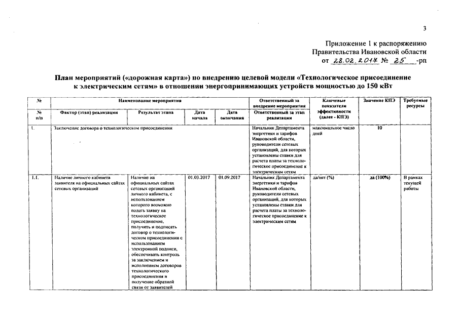 Распоряжение Правительства Ивановской области от 28.02.2017 N 25-рп "Об утверждении планов мероприятий ("дорожных карт") по внедрению целевых моделей "Технологическое присоединение к электрическим сетям", "Подключение (технологическое присоединение) к сетям газораспределения", "Подключение к системам теплоснабжения, подключение (технологическое присоединение) к централизованным системам водоснабжения и водоотведения" (вместе с "Планом мероприятий ("дорожной картой") по внедрению целевой модели "Технологическое присоединение к электрическим сетям" в отношении энергопринимающих устройств мощностью до 150 кВт", "Планом мероприятий ("дорожной картой") по внедрению целевой модели "Подключение к системам теплоснабжения, подключение (технологическое присоединение) к централизованным системам водоснабжения и водоотведения" с нагрузками до 1,5 Гкал/час и не более 10 м3/час соответственно", "Планом мероприятий ("дорожной картой") по внедрению целевой модели по направлению "Подключение к сетям газораспределения" в отношении газоиспользующего оборудования с максимальным расходом газа от 15 до 42 куб. метров в час, с проектным рабочим давлением в присоединяемом газопроводе-вводе не более 0,3 МПа и расстоянием от земельного участка заявителя до сети газораспределения, измеряемым по прямой линии, не более 150 метров")