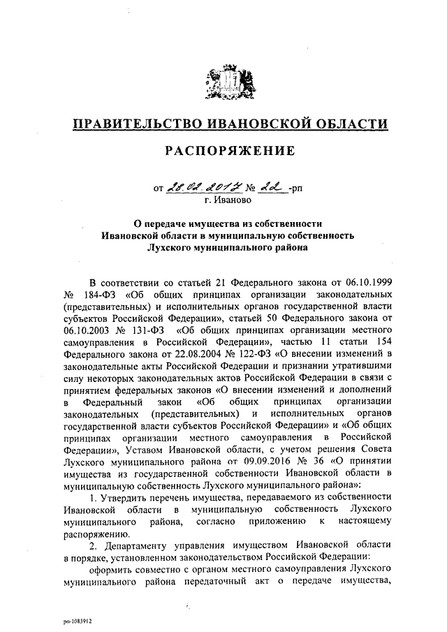 Распоряжение Правительства Ивановской области от 28.02.2017 N 22-рп "О передаче имущества из собственности Ивановской области в муниципальную собственность Лухского муниципального района" (вместе с "Перечнем имущества, передаваемого из собственности Ивановской области в муниципальную собственность Лухского муниципального района")