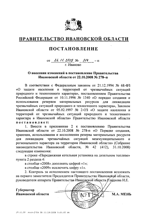 Постановление Правительства Ивановской области от 26.11.2008 N 314-п "О внесении изменений в постановление Правительства Ивановской области от 22.10.2008 N 278-п"