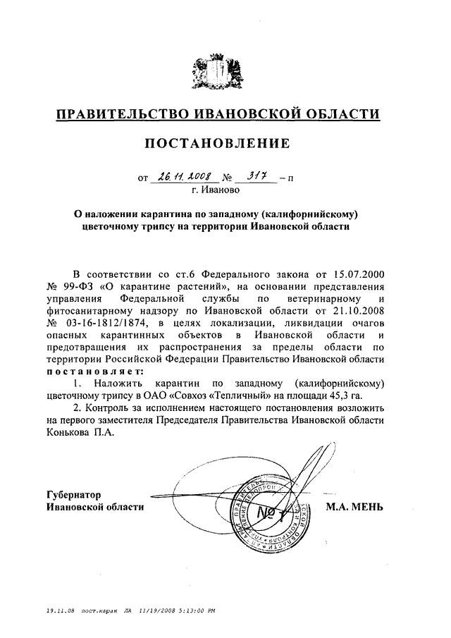 Постановление Правительства Ивановской области от 26.11.2008 N 317-п "О наложении карантина по западному (калифорнийскому) цветочному трипсу на территории Ивановской области"
