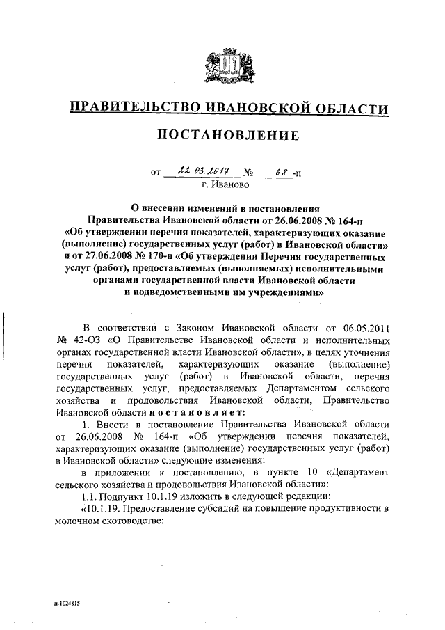 Постановление Правительства Ивановской области от 22.03.2017 N 68-п "О внесении изменений в постановления Правительства Ивановской области от 26.06.2008 N 164-п "Об утверждении перечня показателей, характеризующих оказание (выполнение) государственных услуг (работ) в Ивановской области" и от 27.06.2008 N 170-п "Об утверждении Перечня государственных услуг (работ), предоставляемых (выполняемых) исполнительными органами государственной власти Ивановской области и подведомственными им учреждениями"