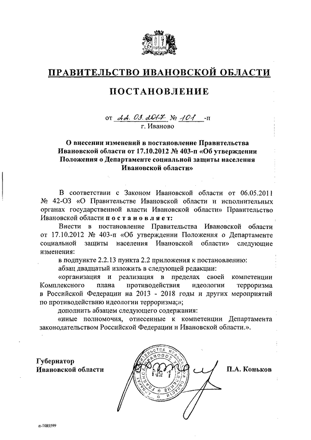 Постановление Правительства Ивановской области от 22.03.2017 N 101-п "О внесении изменений в постановление Правительства Ивановской области от 17.10.2012 N 403-п "Об утверждении Положения о Департаменте социальной защиты населения Ивановской области"