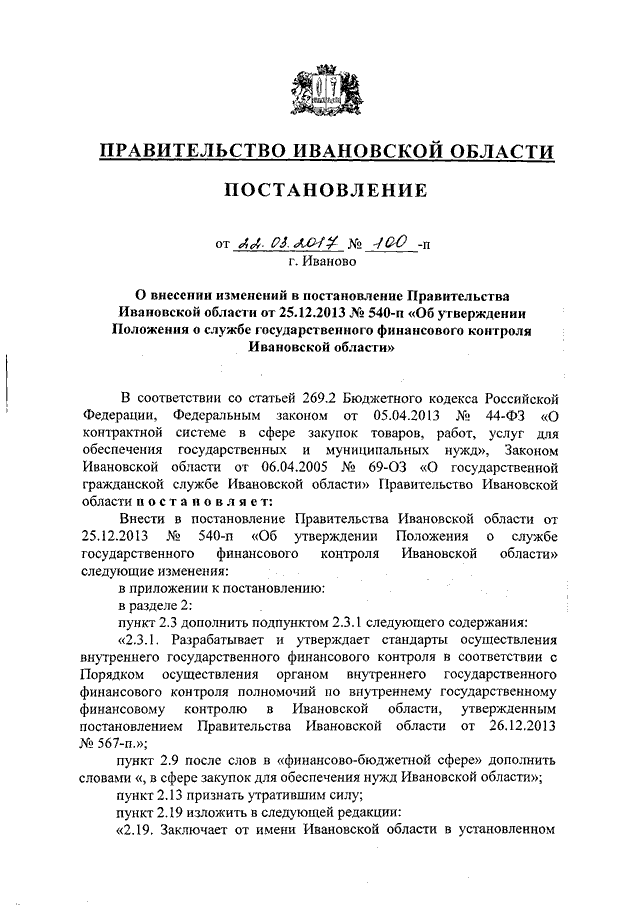 Постановление Правительства Ивановской области от 22.03.2017 N 100-п "О внесении изменений в постановление Правительства Ивановской области от 25.12.2013 N 540-п "Об утверждении Положения о службе государственного финансового контроля Ивановской области"