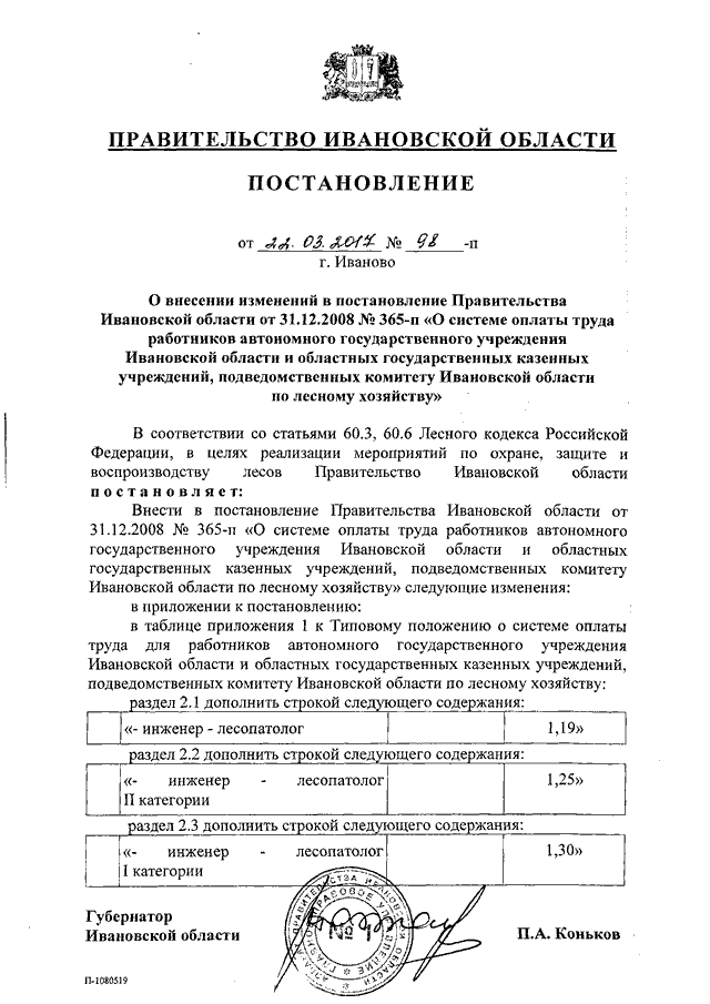 Постановление Правительства Ивановской области от 22.03.2017 N 98-п "О внесении изменений в постановление Правительства Ивановской области от 31.12.2008 N 365-п "О системе оплаты труда работников автономного государственного учреждения Ивановской области и областных государственных казенных учреждений, подведомственных комитету Ивановской области по лесному хозяйству"