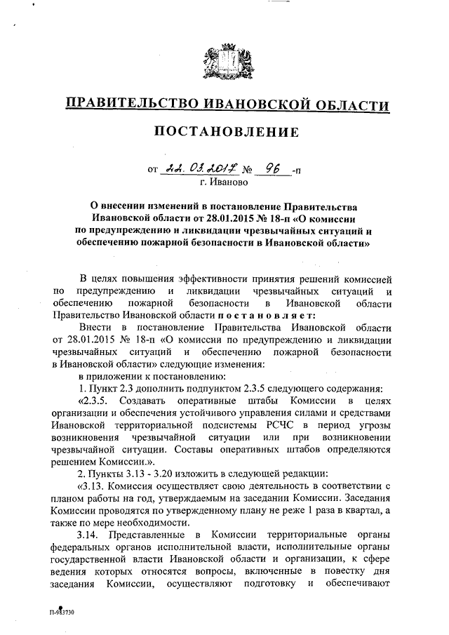 Постановление Правительства Ивановской области от 22.03.2017 N 96-п "О внесении изменений в постановление Правительства Ивановской области от 28.01.2015 N 18-п "О комиссии по предупреждению и ликвидации чрезвычайных ситуаций и обеспечению пожарной безопасности в Ивановской области"