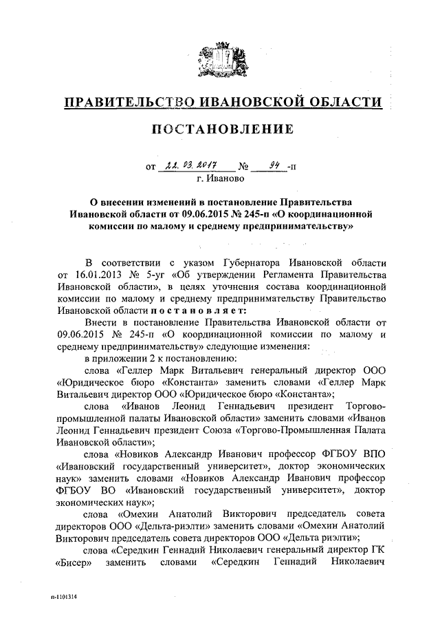 Постановление Правительства Ивановской области от 22.03.2017 N 94-п "О внесении изменений в постановление Правительства Ивановской области от 09.06.2015 N 245-п "О координационной комиссии по малому и среднему предпринимательству"