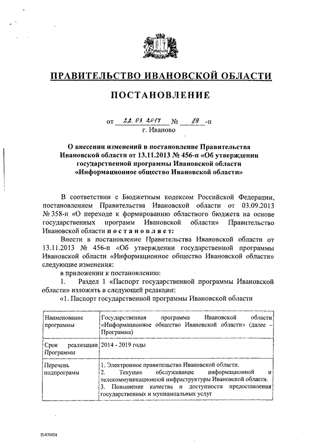Постановление Правительства Ивановской области от 22.03.2017 N 89-п "О внесении изменений в постановление Правительства Ивановской области от 13.11.2013 N 456-п "Об утверждении государственной программы Ивановской области "Информационное общество Ивановской области" (вместе с "Подпрограммой "Электронное правительство Ивановской области", "Подпрограммой "Текущее обслуживание информационной и телекоммуникационной инфраструктуры Ивановской области", "Подпрограммой "Повышение качества и доступности предоставления государственных и муниципальных услуг")