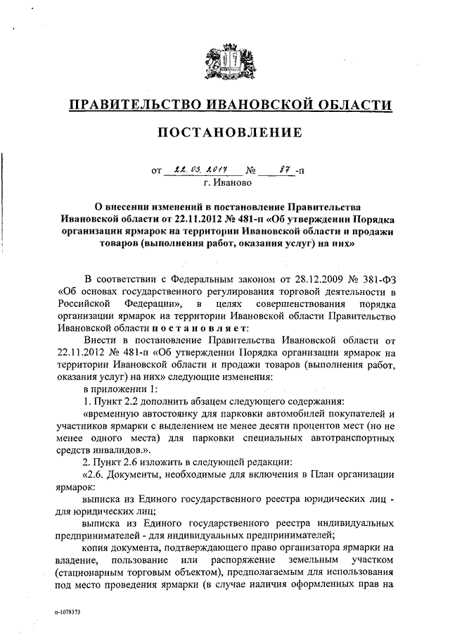 Постановление Правительства Ивановской области от 22.03.2017 N 87-п "О внесении изменений в постановление Правительства Ивановской области от 22.11.2012 N 481-п "Об утверждении Порядка организации ярмарок на территории Ивановской области и продажи товаров (выполнения работ, оказания услуг) на них"