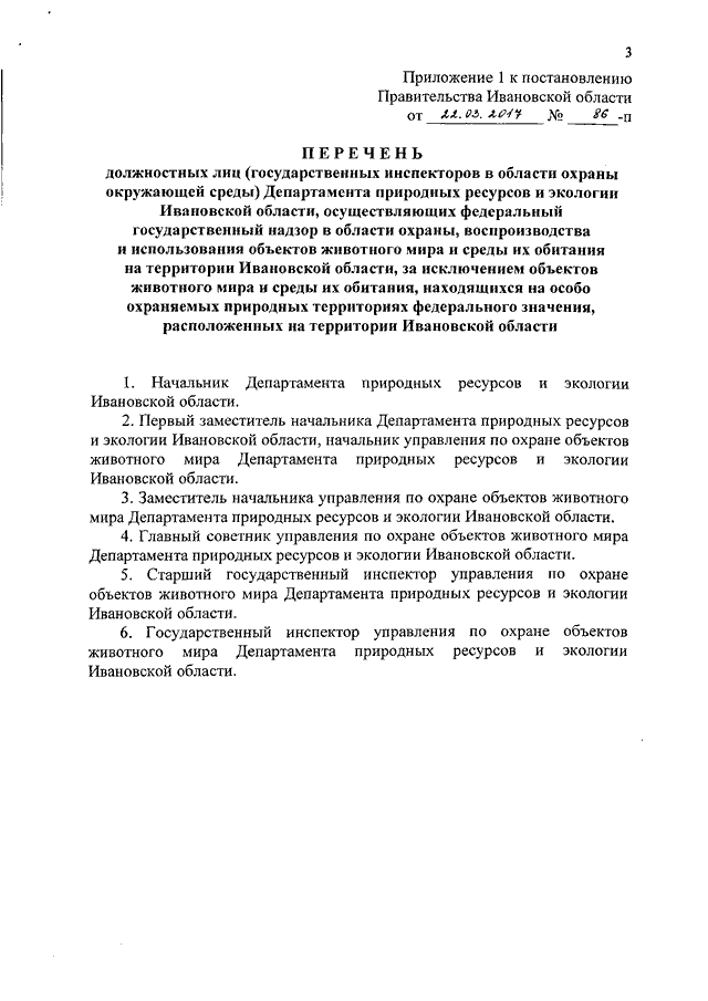 Постановление Правительства Ивановской области от 22.03.2017 N 86-п "Об утверждении перечней должностных лиц, осуществляющих федеральный государственный надзор в области охраны, воспроизводства и использования объектов животного мира и среды их обитания на территории Ивановской области, за исключением объектов животного мира и среды их обитания, находящихся на особо охраняемых природных территориях федерального значения, расположенных на территории Ивановской области" (вместе с "Перечнем должностных лиц (государственных инспекторов в области охраны окружающей среды) Департамента природных ресурсов и экологии Ивановской области, осуществляющих федеральный государственный надзор в области охраны, воспроизводства и использования объектов животного мира и среды их обитания на территории Ивановской области, за исключением объектов животного мира и среды их обитания, находящихся на особо охраняемых природных территориях федерального значения, расположенных на территории Ивановской области", "Перечнем должностных лиц (государственных инспекторов в области охраны окружающей среды) Ивановского областного казенного учреждения по охране и использованию животного мира, осуществляющих федеральный государственный надзор в области охраны, воспроизводства и использования объектов животного мира и среды их обитания на территории Ивановской области, за исключением объектов животного мира и среды их обитания, находящихся на особо охраняемых природных территориях федерального значения, расположенных на территории Ивановской области")