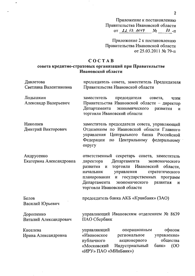 Постановление Правительства Ивановской области от 22.03.2017 N 83-п "О внесении изменения в постановление Правительства Ивановской области от 25.03.2011 N 79-п "О совете кредитно-страховых организаций при Правительстве Ивановской области"