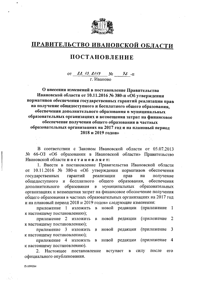Постановление Правительства Ивановской области от 22.03.2017 N 72-п "О внесении изменений в постановление Правительства Ивановской области от 10.11.2016 N 380-п "Об утверждении нормативов обеспечения государственных гарантий реализации прав на получение общедоступного и бесплатного общего образования, обеспечения дополнительного образования в муниципальных образовательных организациях и возмещения затрат на финансовое обеспечение получения общего образования в частных образовательных организациях на 2017 год и на плановый период 2018 и 2019 годов" (вместе с "Нормативами обеспечения государственных гарантий реализации прав на получение общедоступного и бесплатного дошкольного, начального общего, основного общего, среднего общего образования в муниципальных общеобразовательных организациях, обеспечения дополнительного образования в муниципальных общеобразовательных организациях на 2017 год и на плановый период 2018 и 2019 годов", "Нормативами возмещения затрат на финансовое обеспечение получения дошкольного, начального общего, основного общего, среднего общего образования в частных общеобразовательных организациях, осуществляющих образовательную деятельность по имеющим государственную аккредитацию основным общеобразовательным программам, на 2017 год и на плановый период 2018 и 2019 годов", "Нормативами обеспечения государственных гарантий реализации прав на получение общедоступного и бесплатного дошкольного образования в муниципальных дошкольных образовательных организациях на 2017 год и на плановый период 2018 и 2019 годов", "Нормативами возмещения затрат на финансовое обеспечение получения дошкольного образования в частных дошкольных образовательных организациях на 2017 год и на плановый период 2018 и 2019 годов")