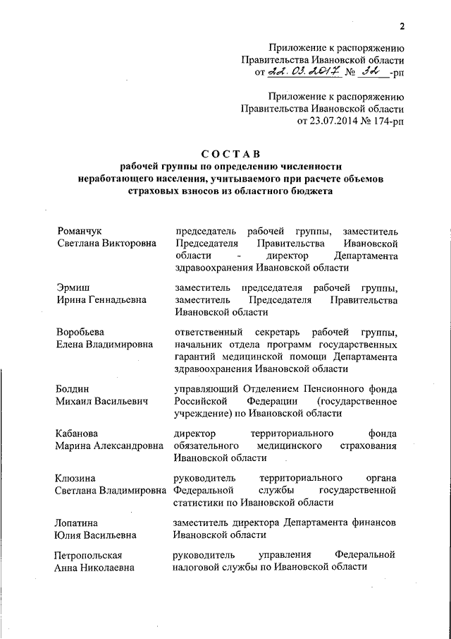 Распоряжение Правительства Ивановской области от 22.03.2017 N 32-рп "О внесении изменения в распоряжение Правительства Ивановской области от 23.07.2014 N 174-рп "О создании рабочей группы по определению численности неработающего населения, учитываемого при расчете объемов страховых взносов из областного бюджета"