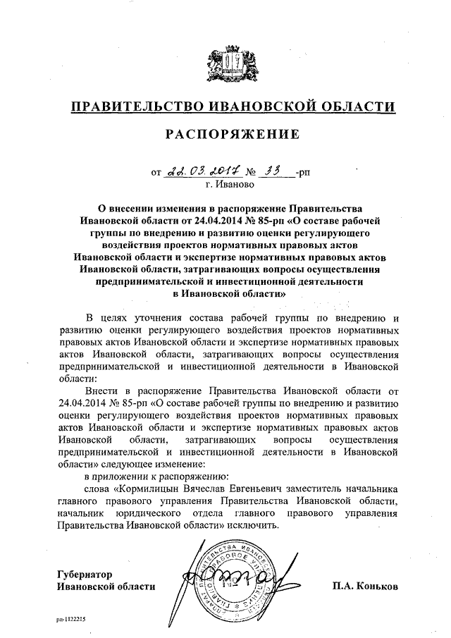 Распоряжение Правительства Ивановской области от 22.03.2017 N 33-рп "О внесении изменения в распоряжение Правительства Ивановской области от 24.04.2014 N 85-рп "О составе рабочей группы по внедрению и развитию оценки регулирующего воздействия проектов нормативных правовых актов Ивановской области и экспертизе нормативных правовых актов Ивановской области, затрагивающих вопросы осуществления предпринимательской и инвестиционной деятельности в Ивановской области"