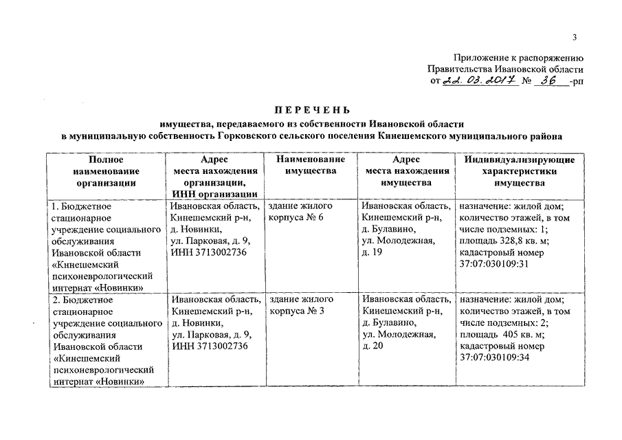 Распоряжение Правительства Ивановской области от 22.03.2017 N 36-рп "О передаче имущества из собственности Ивановской области в муниципальную собственность Горковского сельского поселения Кинешемского муниципального района"