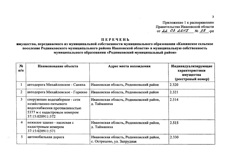 Распоряжение Правительства Ивановской области от 22.03.2017 N 37-рп "О разграничении имущества, находящегося в муниципальной собственности, между муниципальным образованием "Родниковский муниципальный район" и сельскими поселениями, входящими в его состав, в связи с изменением перечня вопросов местного значения сельского поселения"