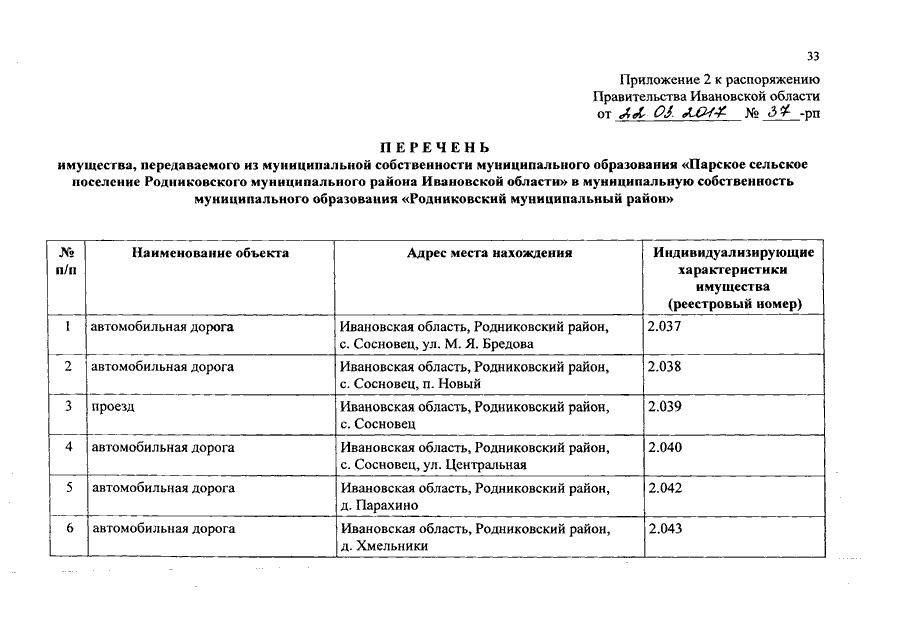 Распоряжение Правительства Ивановской области от 22.03.2017 N 37-рп "О разграничении имущества, находящегося в муниципальной собственности, между муниципальным образованием "Родниковский муниципальный район" и сельскими поселениями, входящими в его состав, в связи с изменением перечня вопросов местного значения сельского поселения"