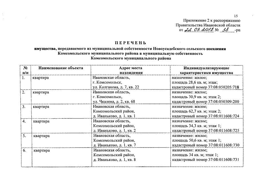 Распоряжение Правительства Ивановской области от 22.03.2017 N 38-рп "О разграничении имущества, находящегося в муниципальной собственности, между Комсомольским муниципальным районом и сельскими поселениями, входящими в его состав, в связи с изменением перечня вопросов местного значения сельского поселения"