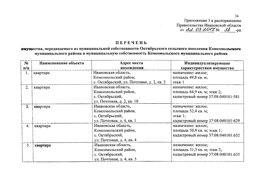 Распоряжение Правительства Ивановской области от 22.03.2017 N 38-рп "О разграничении имущества, находящегося в муниципальной собственности, между Комсомольским муниципальным районом и сельскими поселениями, входящими в его состав, в связи с изменением перечня вопросов местного значения сельского поселения"