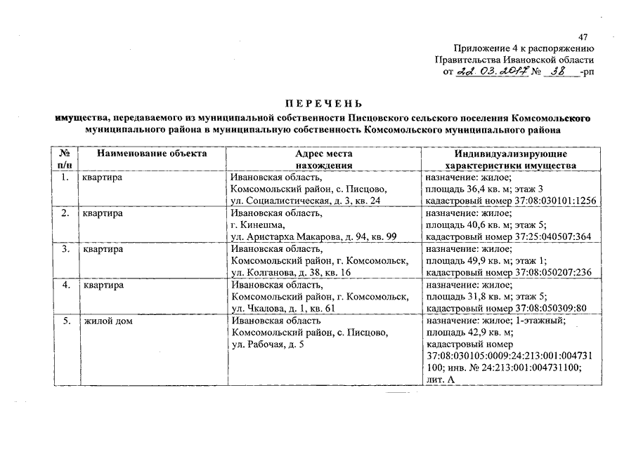 Распоряжение Правительства Ивановской области от 22.03.2017 N 38-рп "О разграничении имущества, находящегося в муниципальной собственности, между Комсомольским муниципальным районом и сельскими поселениями, входящими в его состав, в связи с изменением перечня вопросов местного значения сельского поселения"