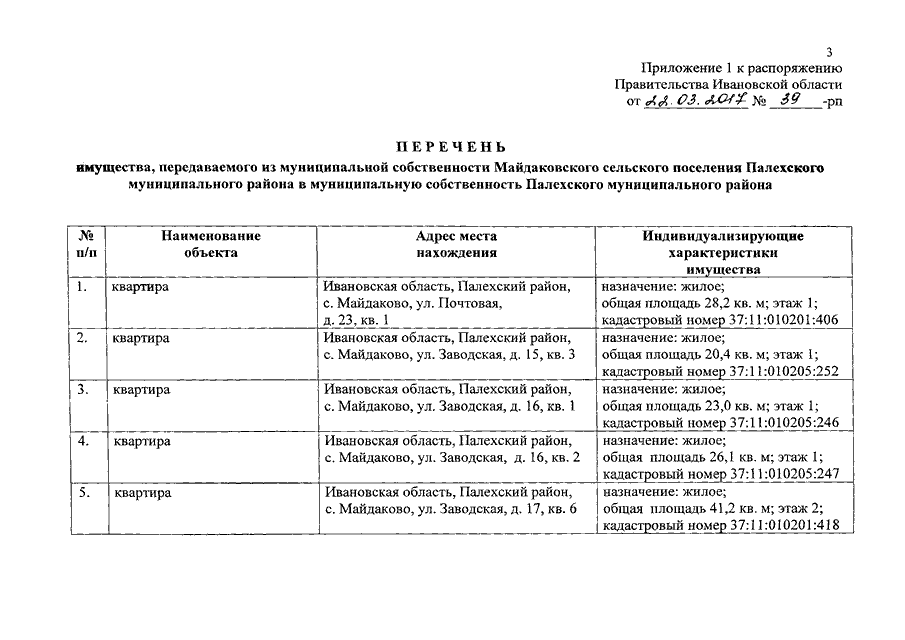 Распоряжение Правительства Ивановской области от 22.03.2017 N 39-рп "О разграничении имущества, находящегося в муниципальной собственности, между Палехским муниципальным районом и сельскими поселениями, входящими в его состав, в связи с изменением перечня вопросов местного значения сельского поселения"
