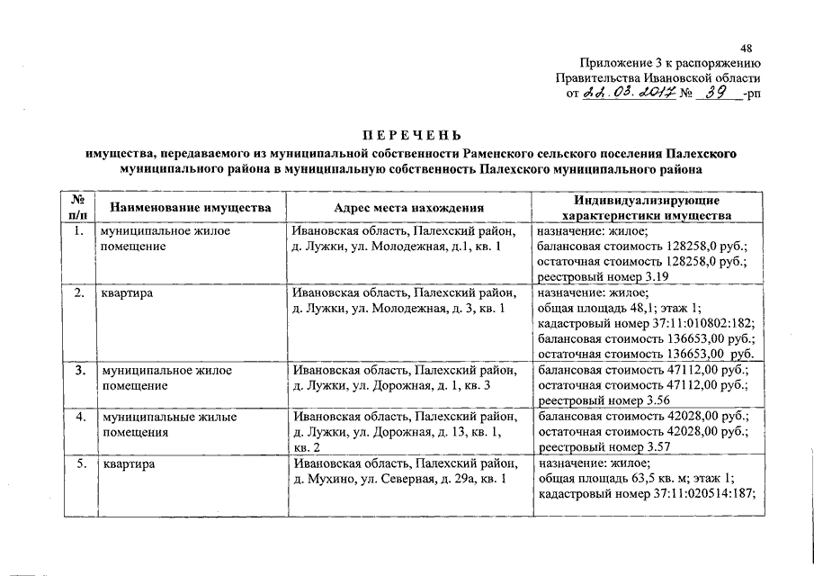 Распоряжение Правительства Ивановской области от 22.03.2017 N 39-рп "О разграничении имущества, находящегося в муниципальной собственности, между Палехским муниципальным районом и сельскими поселениями, входящими в его состав, в связи с изменением перечня вопросов местного значения сельского поселения"