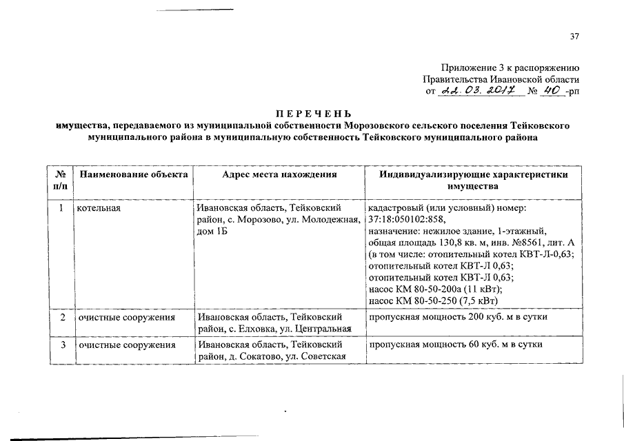Распоряжение Правительства Ивановской области от 22.03.2017 N 40-рп "О разграничении имущества, находящегося в муниципальной собственности, между Тейковским муниципальным районом и сельскими поселениями, входящими в его состав, в связи с изменением перечня вопросов местного значения сельского поселения"