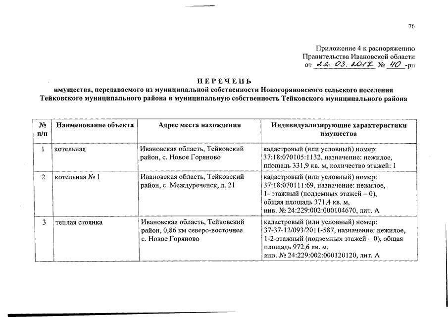 Распоряжение Правительства Ивановской области от 22.03.2017 N 40-рп "О разграничении имущества, находящегося в муниципальной собственности, между Тейковским муниципальным районом и сельскими поселениями, входящими в его состав, в связи с изменением перечня вопросов местного значения сельского поселения"