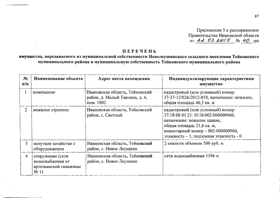 Распоряжение Правительства Ивановской области от 22.03.2017 N 40-рп "О разграничении имущества, находящегося в муниципальной собственности, между Тейковским муниципальным районом и сельскими поселениями, входящими в его состав, в связи с изменением перечня вопросов местного значения сельского поселения"