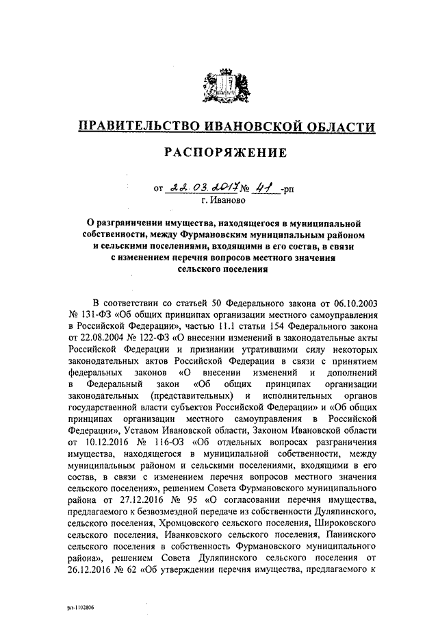 Распоряжение Правительства Ивановской области от 22.03.2017 N 41-рп "О разграничении имущества, находящегося в муниципальной собственности, между Фурмановским муниципальным районом и сельскими поселениями, входящими в его состав, в связи с изменением перечня вопросов местного значения сельского поселения"