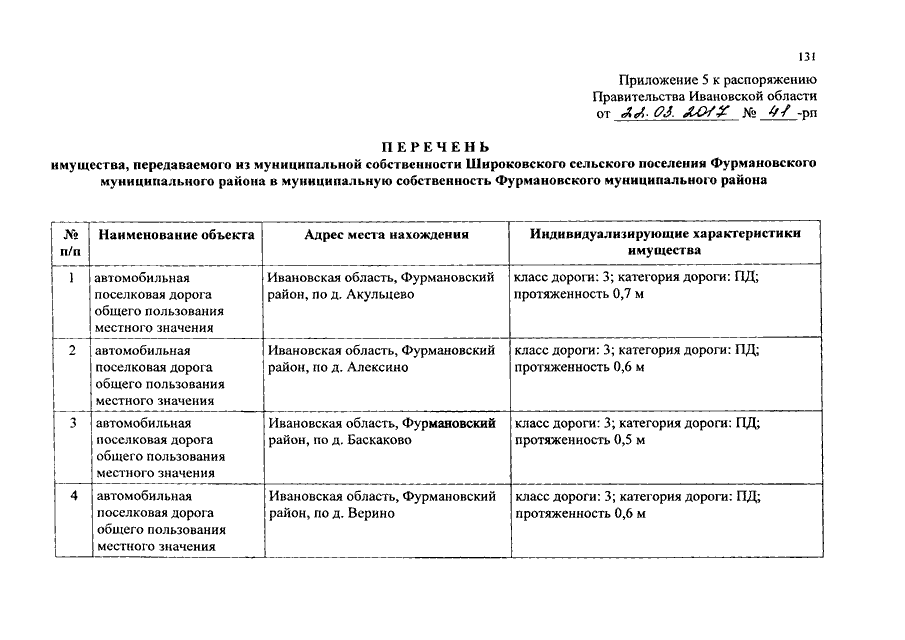 Распоряжение Правительства Ивановской области от 22.03.2017 N 41-рп "О разграничении имущества, находящегося в муниципальной собственности, между Фурмановским муниципальным районом и сельскими поселениями, входящими в его состав, в связи с изменением перечня вопросов местного значения сельского поселения"
