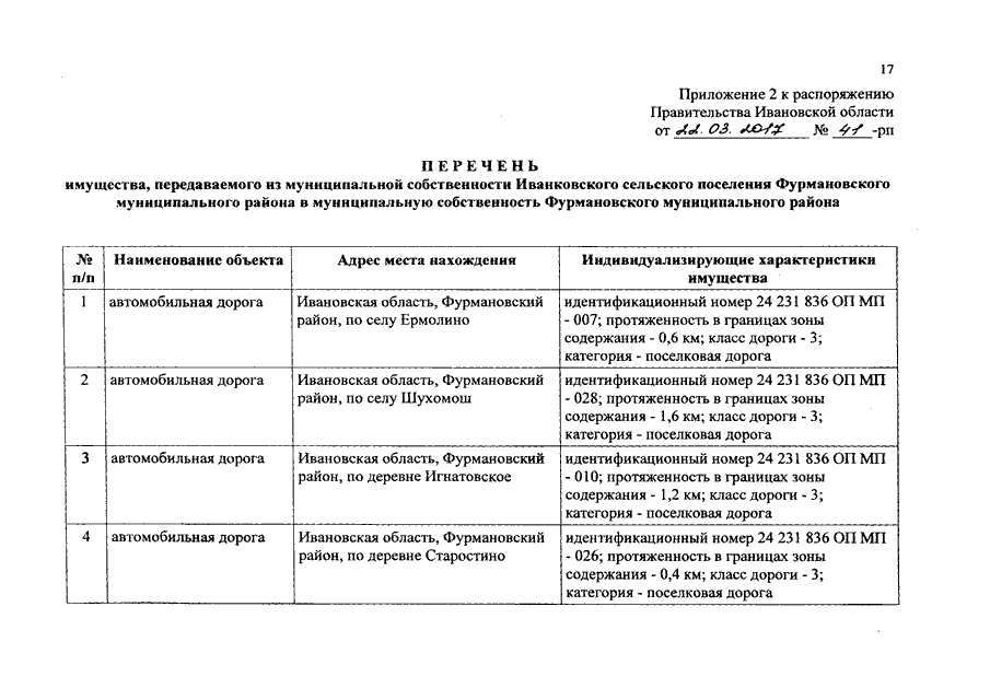 Распоряжение Правительства Ивановской области от 22.03.2017 N 41-рп "О разграничении имущества, находящегося в муниципальной собственности, между Фурмановским муниципальным районом и сельскими поселениями, входящими в его состав, в связи с изменением перечня вопросов местного значения сельского поселения"