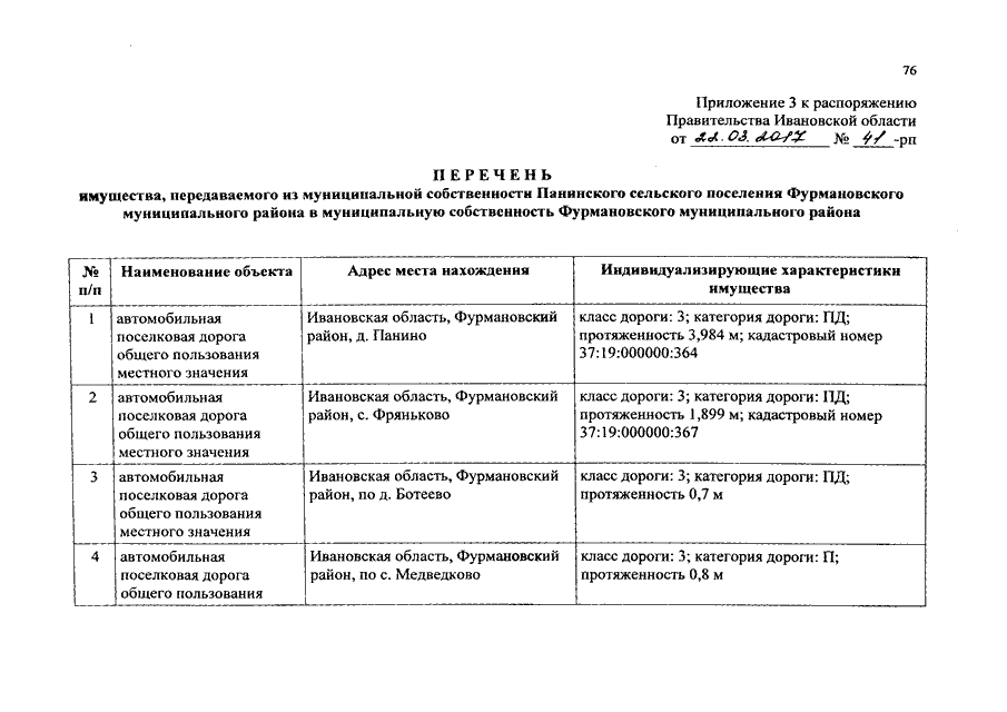 Распоряжение Правительства Ивановской области от 22.03.2017 N 41-рп "О разграничении имущества, находящегося в муниципальной собственности, между Фурмановским муниципальным районом и сельскими поселениями, входящими в его состав, в связи с изменением перечня вопросов местного значения сельского поселения"