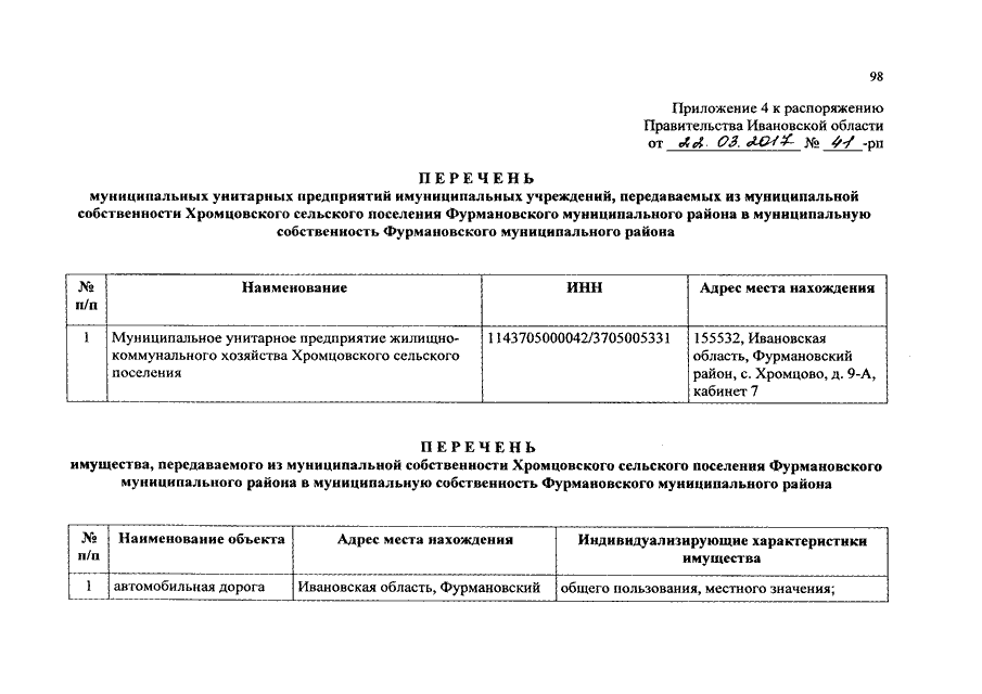 Распоряжение Правительства Ивановской области от 22.03.2017 N 41-рп "О разграничении имущества, находящегося в муниципальной собственности, между Фурмановским муниципальным районом и сельскими поселениями, входящими в его состав, в связи с изменением перечня вопросов местного значения сельского поселения"