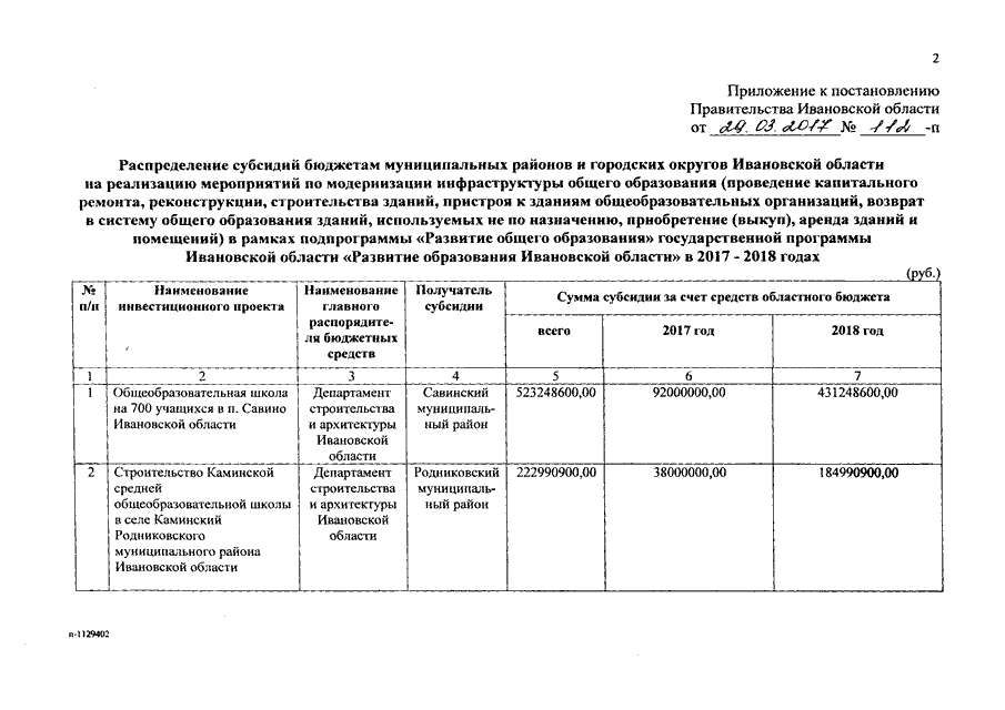 Постановление Правительства Ивановской области от 29.03.2017 N 112-п "О распределении субсидий бюджетам муниципальных районов и городских округов Ивановской области на реализацию мероприятий по модернизации инфраструктуры общего образования (проведение капитального ремонта, реконструкции, строительства зданий, пристроя к зданиям общеобразовательных организаций, возврат в систему общего образования зданий, используемых не по назначению, приобретение (выкуп), аренда зданий и помещений) в рамках подпрограммы "Развитие общего образования" государственной программы Ивановской области "Развитие образования Ивановской области" в 2017 - 2018 годах"